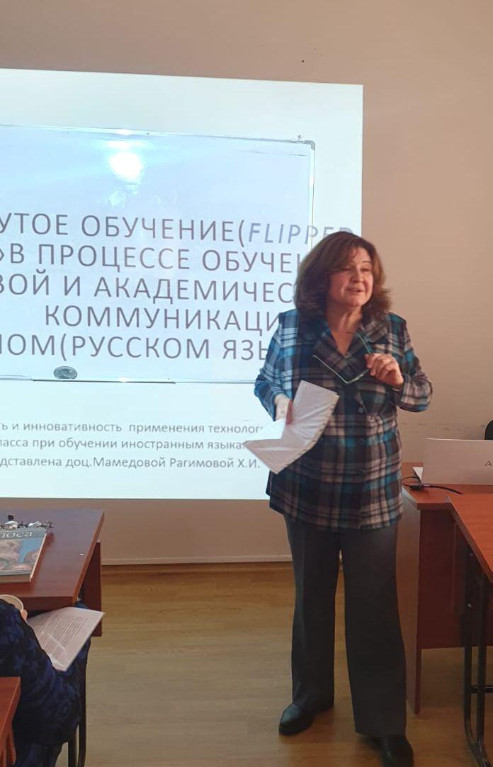 Tədbirdə kafedranın ingilis dili müəllimi Gülnarə İsmayılova və Nilüfər Hüseynova XXI əsrdə xarici dillərin öyrənilməsinə dair əsas tələblər: kommunikativ və funksional yanaşma, rəqəmsal savadlılıq, peşəkar tətbiq, özünütəhsil və davamlılıq mövzusunda məruzələrlə çıxış edib.